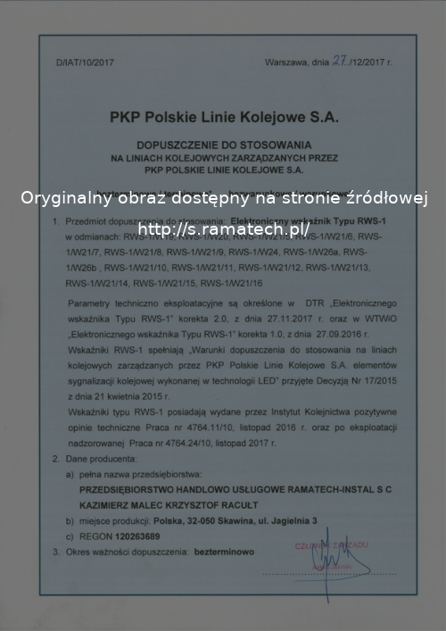 Elektroniczny wskaźnik typu RWS-1 posiada bezterminowe dopuszczenie do stosowania na sieci PKP PLK S.A (D/IAT/10/2017).
